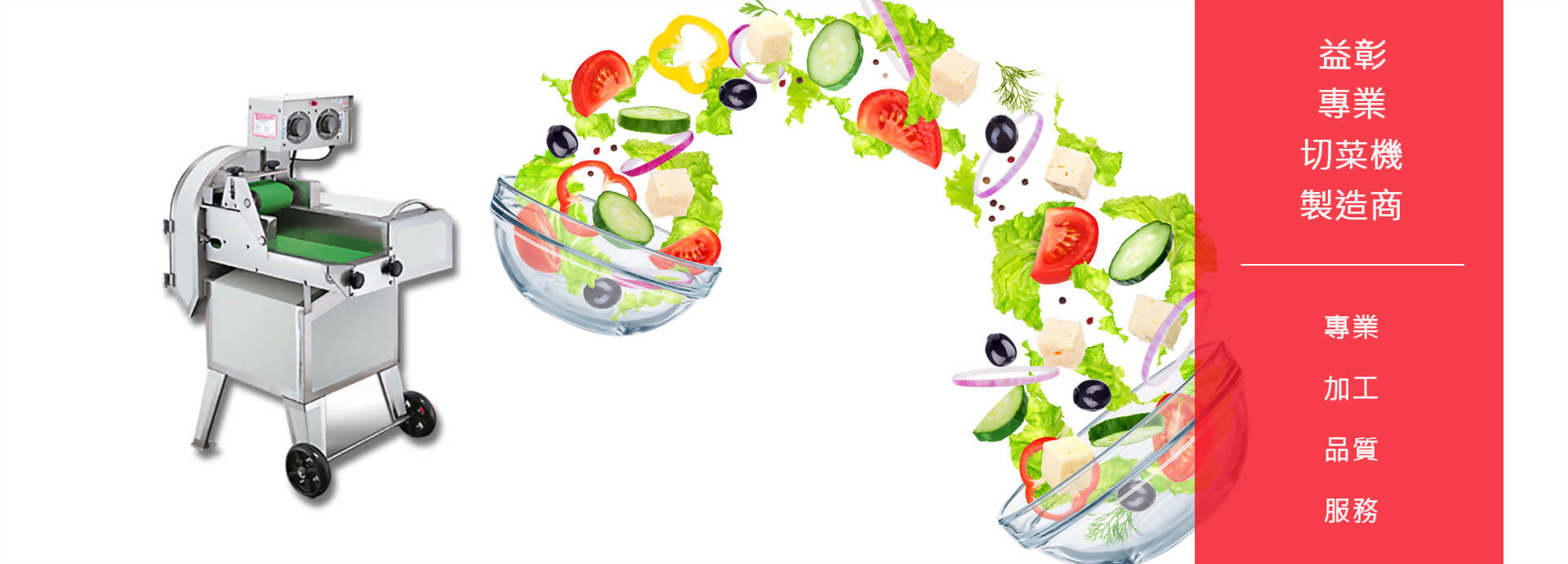 益彰食品機械實業行為切菜機專業製造廠,一貫的經營理念為追求完美、服務客戶。本公司根據各種農產品的特色,與消費者的個別需求,生產不同形式、規格、全系列的切菜機,提供客戶高效率、高生產量,安全可靠,進而節省時間,大大降低工作成本。